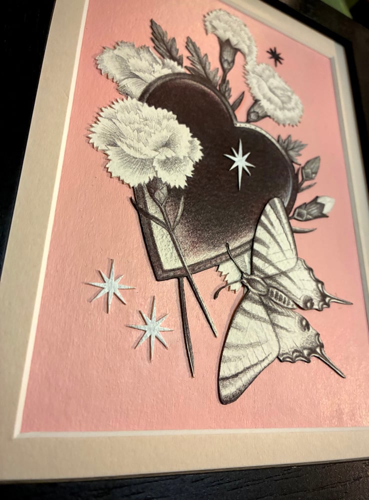 Original. Hand drawn and cut out. Black ballpoint pen on Arches paper, cut-out and fixed to hand painted background.