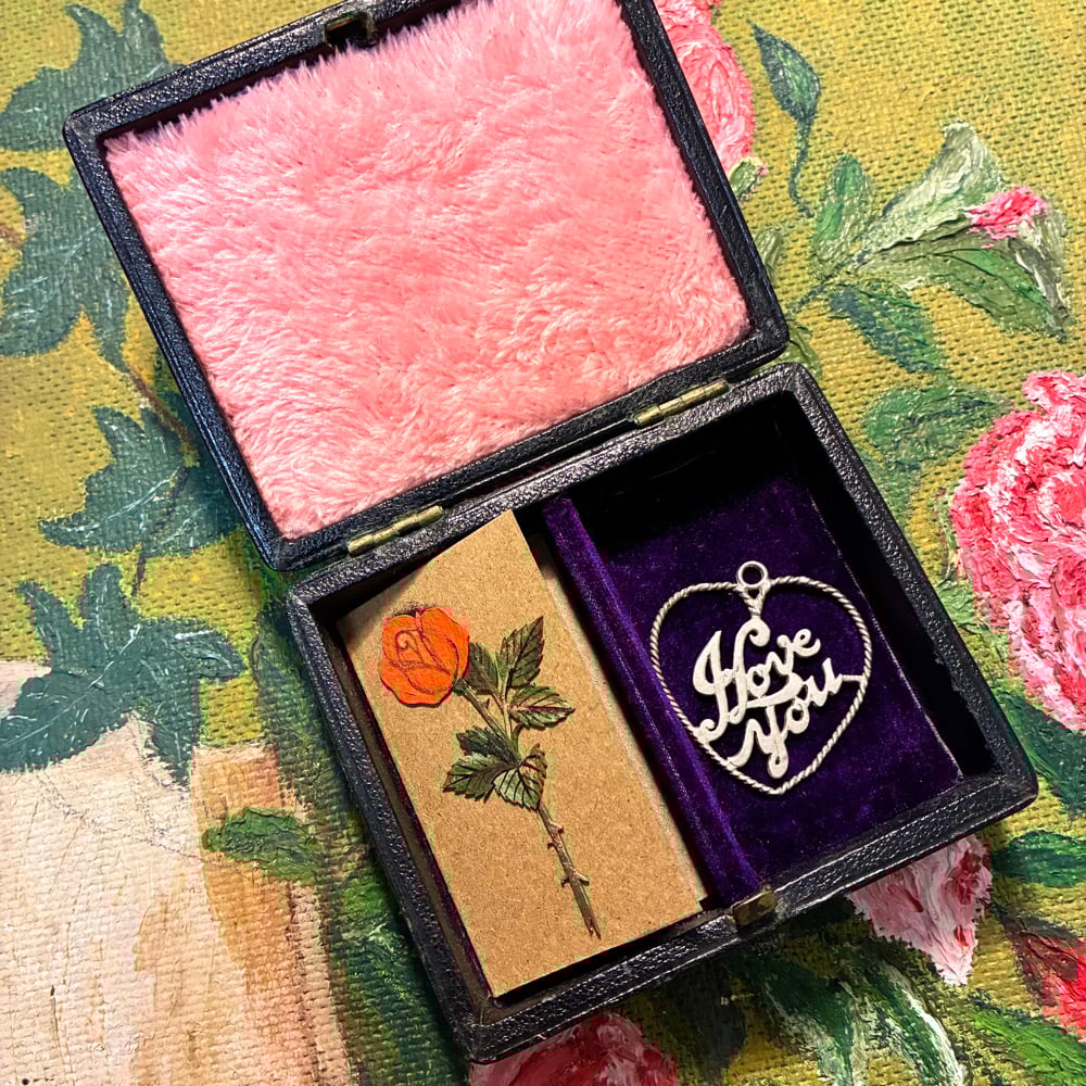 Hand painted antique presentation box containing vintage silver ‘I Love You’ pendant and mini hand painted card.